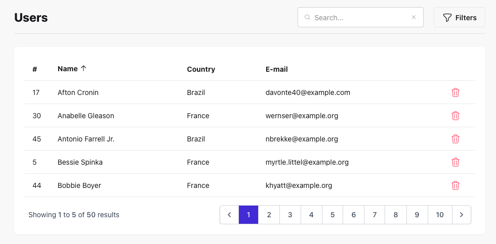 As you can see on the existing users/index.blade.php example component you can already sort and filter, but the data is hardcoded. Let's fix it now!